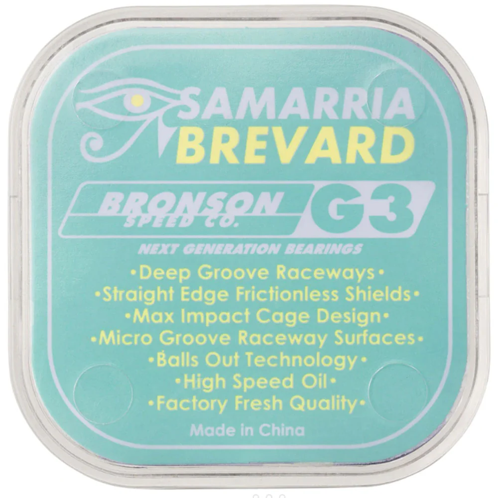 Bronson Speed Co. Skateboard Bearings Samarria Brevard Pro G3. Deep Groove Raceways, High Sped Ceramic Oil, Straight Edge Frictionless Shields, Max Impact Cage Design, Balls Out Technology.